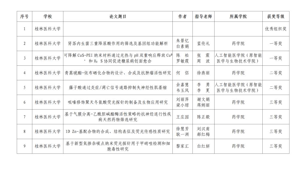 在近日公布的“第二十六届广西高校大学生化学化工类学术创新成果大赛”评审结果中,我校首次荣获“优秀组织奖”,药学院与人工智能医学院(原智能医学与生物技术学院)学子表现优异,具体获奖情况如下:药学院获一等奖1项、二等奖1项、三等奖4项;人工智能医学院获一等奖1项、二等奖1项。