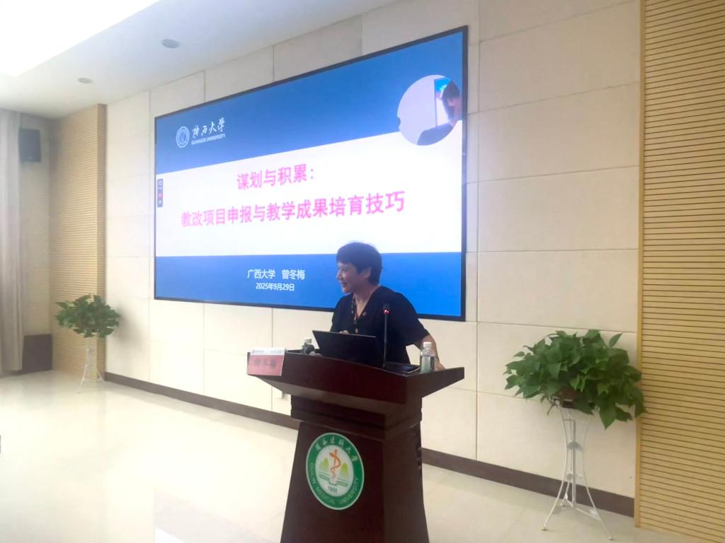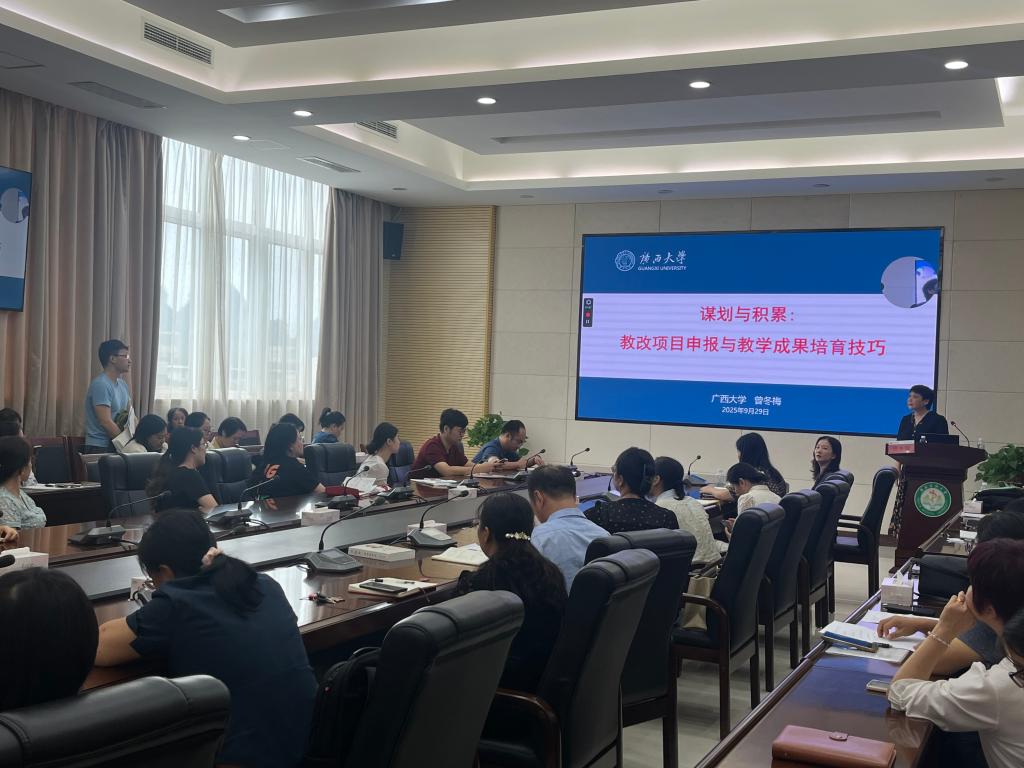 9月29日上午,我校在明德楼502会议室开展“特色一流本科”大家讲坛,特邀广西大学行健文理学院院长曾冬梅教授作《谋划与积累:教改项目申报与教学成果培育技巧》专题报告。各学院教学负责人、拟申报2025年校级教改课题的教师及相关管理人员近百余人参加此次学习。