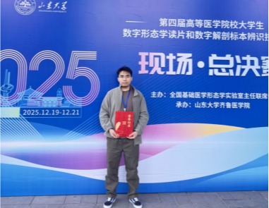 12月20日,在济南举办的“第四届高等医学院校大学生数字形态学读片和数字解剖标本辨识技能大赛”全国总决赛中,我校2022级临床医学专业的张焕杨同学凭借出色的表现,荣获解剖学组特等奖——银奖。