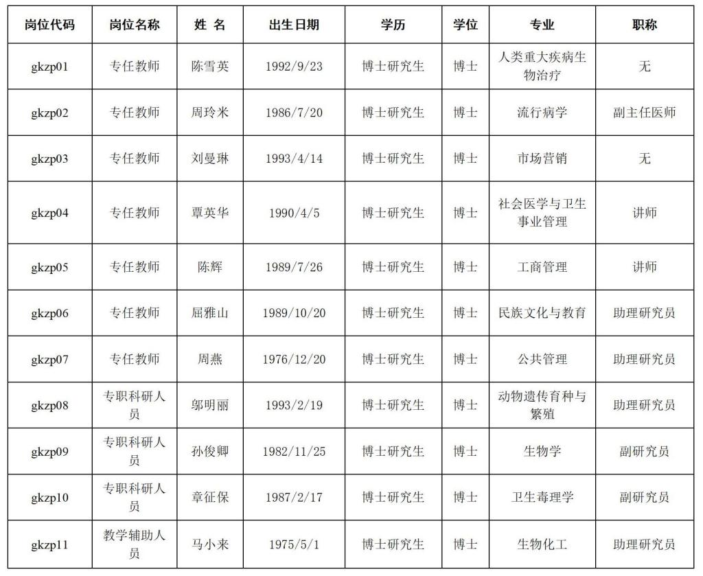 根据《桂林医学院2023年度公开招聘高层次人才公告》的有关安排和规定,经资格审查、面试、政审和体检后,拟聘用陈雪英等11名博士;现将拟聘用人员基本情况予以公示,公示期7个工作日(2024年3月12日至2024年3月20日)。