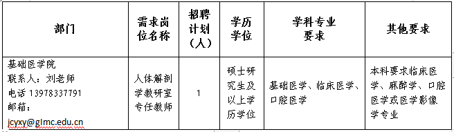 (一)应聘者将《桂林医学院应聘人员登记表》(附件1),《桂林医学院应聘表》(附件2)及相关支撑材料扫描件发送到招聘岗位所在部门邮箱(见岗位需求计划表);
