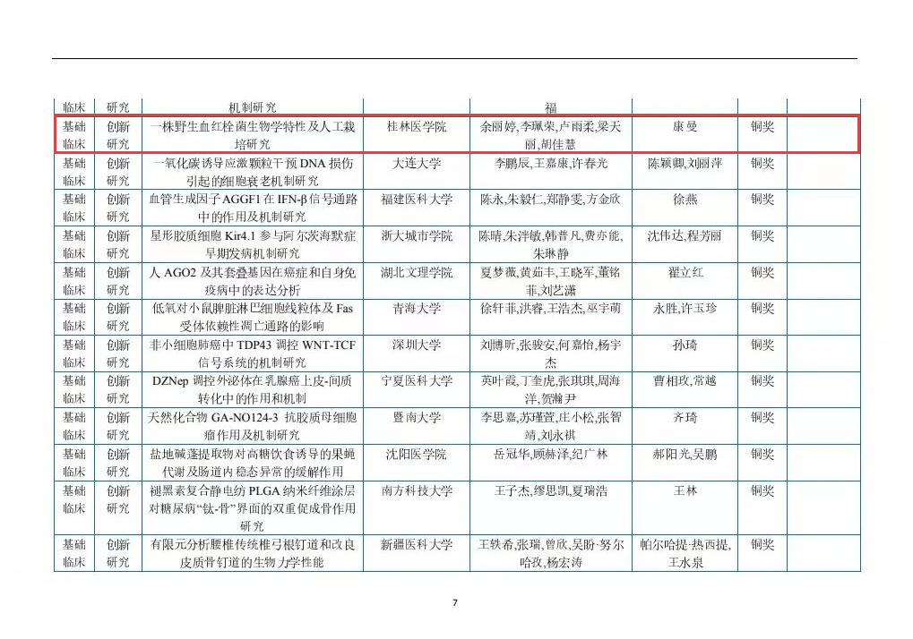 1月14日-15日,由高等学校国家级实验教学示范中心联席会基础医学组主办、吉林大学承办的第八届全国大学生基础医学创新研究暨实验设计论坛全国总决赛在吉林大学医学院圆满落下帷幕。我校“一株野生血红栓菌生物学特性及人工栽培研究”项目团队获得铜奖,指导教师为基础医学院康曼博士。这也是广西地区高校在该赛事上唯一的获奖作品。