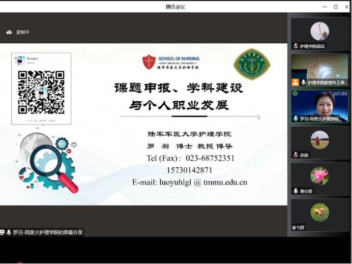 会议邀请陆军军医大学护理学院院长罗羽教授作题为“课题申报、学科建设与个人职业发展”的报告。她从自身职业发展经历、研究团队组建和学科建设过程鼓励护理人员不畏困难,勇于付出。她认为树立信心和改变观念对提升护理人员从事科研的动力和水平至关重要。