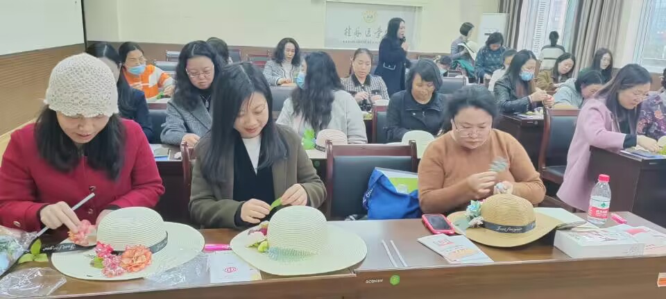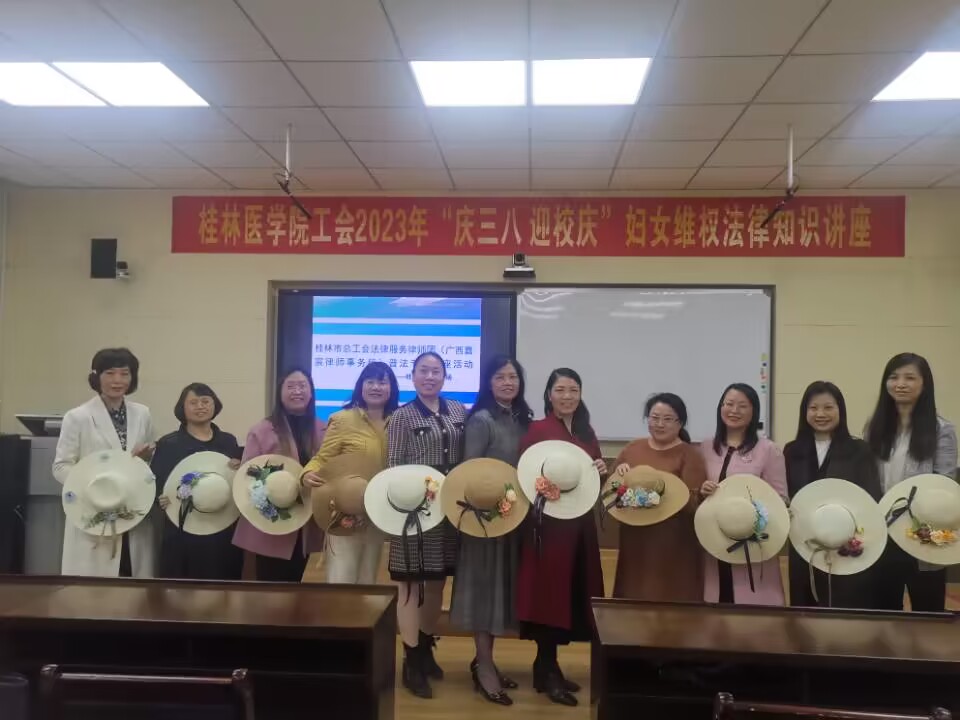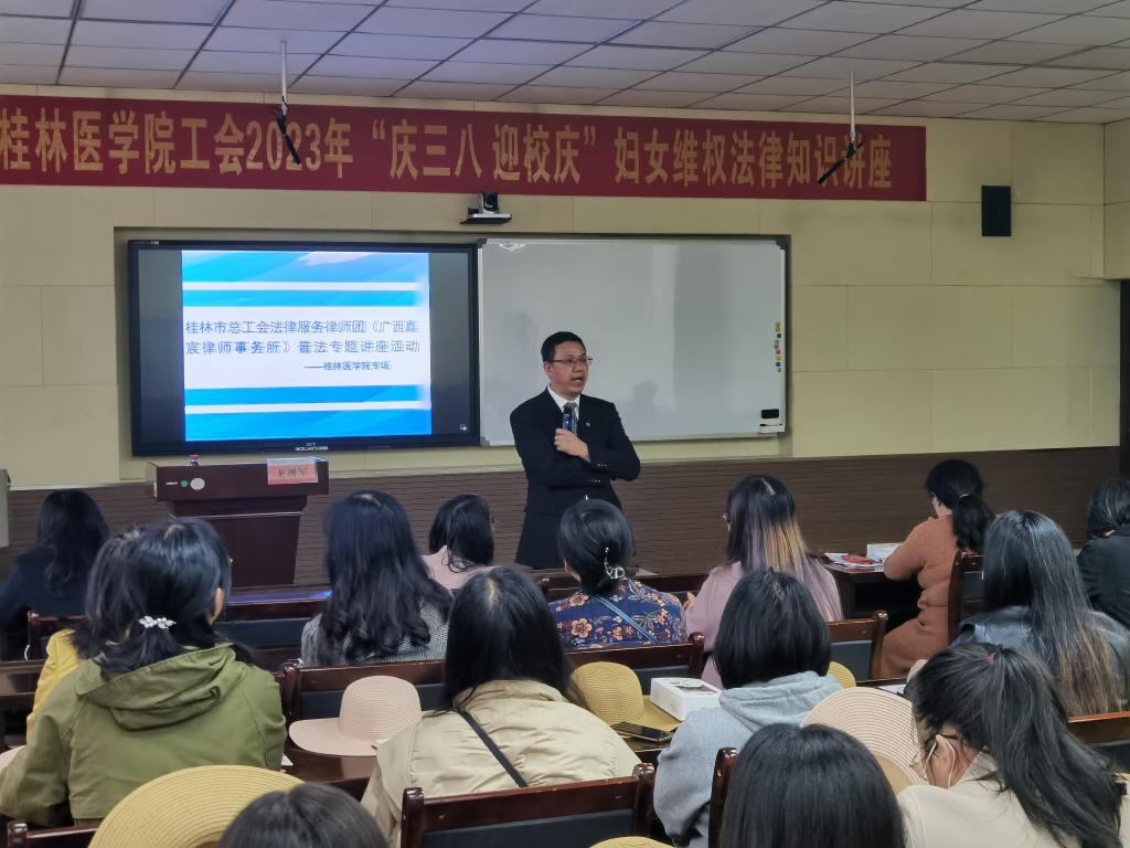 阳春三月,春意盎然。为庆祝第113个“三八”国际妇女节及建校88周年,提高广大女职工的法律意识,增强维护自身合法权益和自我保护能力,同时丰富女职工的文化生活,展现巾帼风采,3月6日下午,校工会、女工委在临桂校区明德楼202会议室组织开展“庆三八 迎校庆”妇女维权知识讲座及手工创意制作活动。此次活动邀请了广西嘉宸律师事务所龙拥军律师作专题讲座,近70名女职工参加了本次活动。