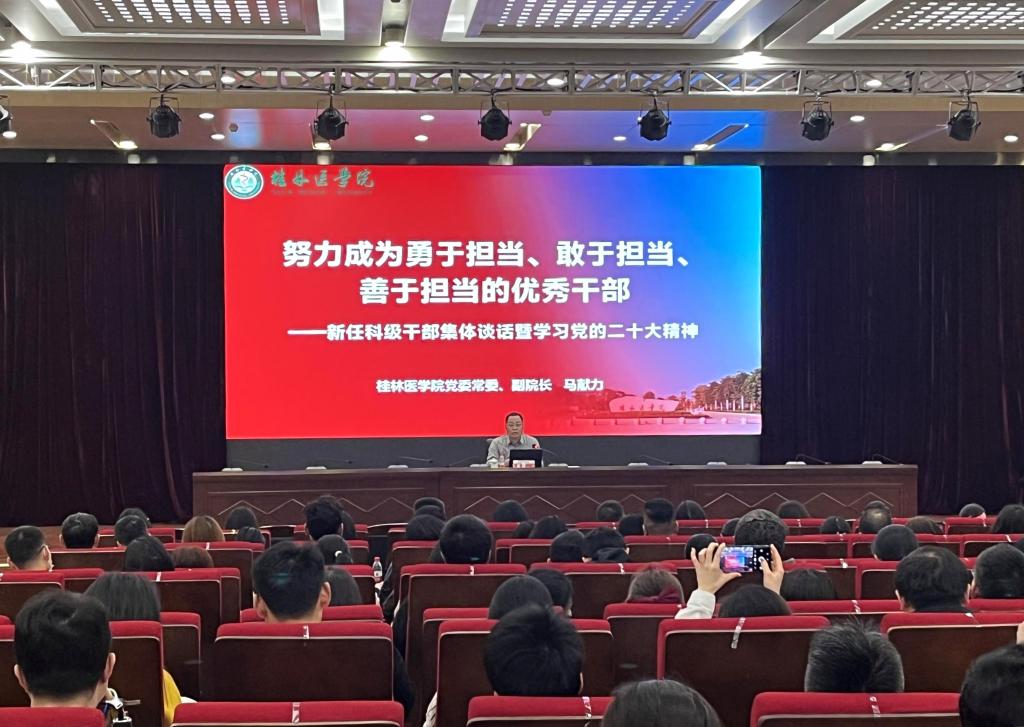 为进一步贯彻落实党的二十大精神,提升学校科级干部履职能力,着力打造敢担当、能担当、会担当、善担当的干部队伍,3月16日下午,我校在临桂校区教学北楼多功能报告厅举办了新任科级干部集体谈话暨学习党的二十大精神专题培训会。校党委常委、副院长马献力作题为《努力成为勇于担当、敢于担当、善于担当的优秀干部》的专题培训,全体科级干部参会。