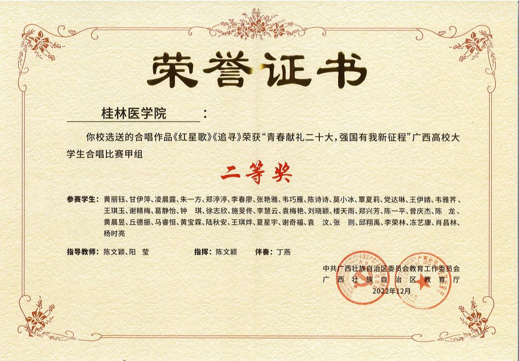 近日,自治区党委教育工委、自治区教育厅印发《关于公布“青春献礼二十大,强国有我新征程”广西高校大学生合唱比赛结果的通知》。我校大学生艺术团合唱团作品《红星歌》《追寻》荣获二等奖,展现了桂医青年良好的艺术素养和精神风貌。