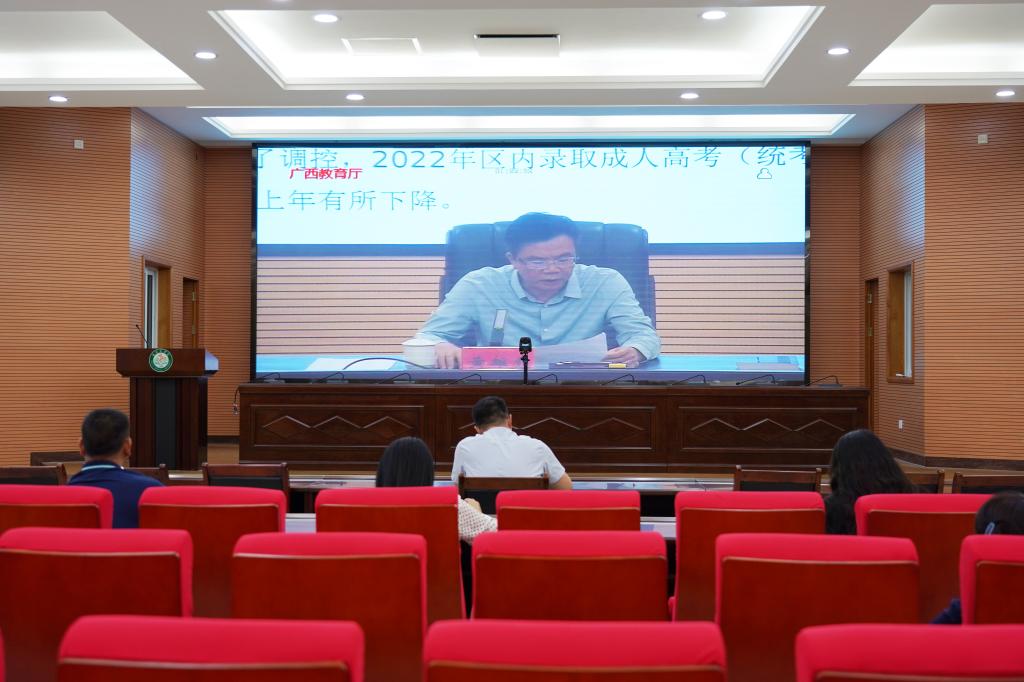 为做好2023年招生计划编制和管理工作,4月19日下午,自治区教育厅办公室组织召开2023年全区高校招生计划管理工作视频会议。自治区教育厅党组副书记、副厅长、一级巡视员黄雄彪出席会议并讲话。我校在临桂校区明德楼101室设分会场,校党委常委、副院长马献力,研究生学院、招生与就业指导中心、继续教育学院、规划处负责人及有关人员参加会议。