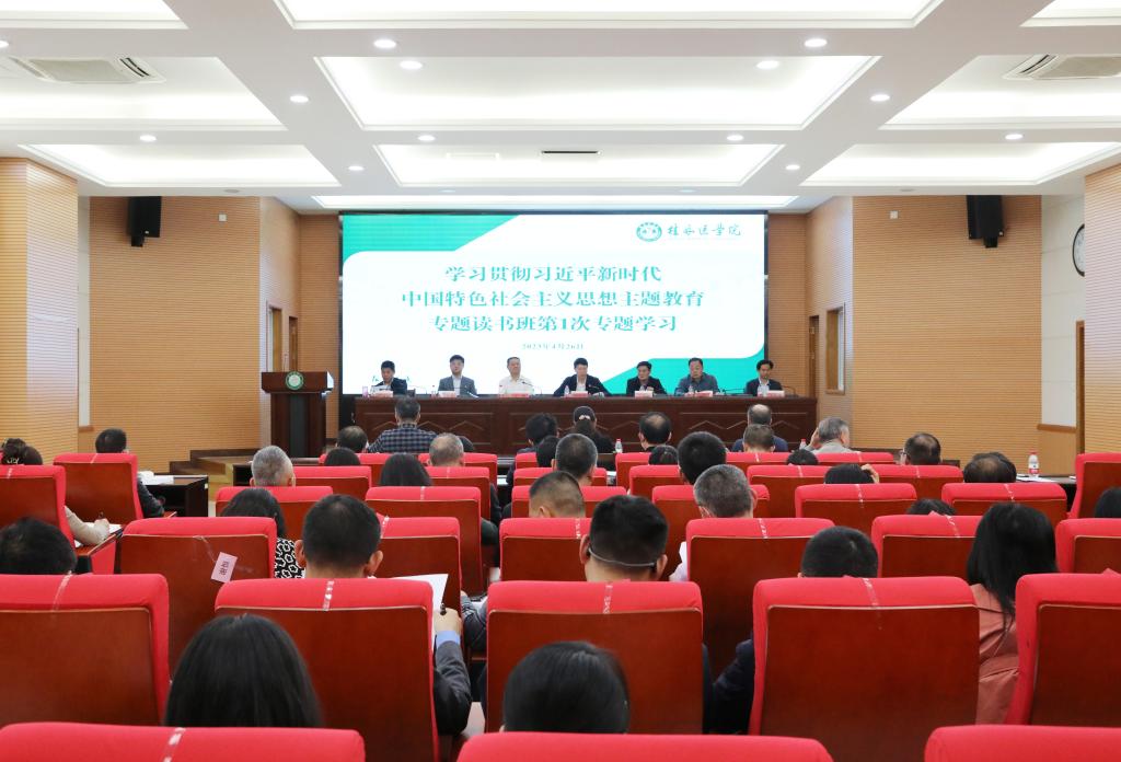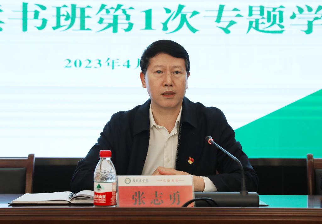 4月26日下午,我校学习贯彻习近平新时代中国特色社会主义思想主题教育专题读书班第1次(第二阶段)专题学习研讨在临桂校区明德楼101会议室举行。校党委书记、院长、党委主题教育领导小组组长张志勇主持专题学习研讨并讲话。在家校领导、机关党委全体中层干部、学校主题教育领导小组办公室成员参加学习研讨。