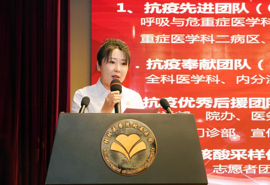 覃克强表示,医院这些年取得的成就,得益于广大桂医附院人数十年来对“弘德善医”院训精神的绵延传承。特别是新冠肺炎疫情发生以来,桂医附院广大医务工作者牢记党和人民重托,冲在院内外疫情防控的一线,彰显了敬佑生命、救死扶伤、甘于奉献、大爱无疆的崇高精神,赢得了党和人民的高度评价。今天获得表彰的先进集体和个人,既有冲锋在一线的抗疫尖兵,也有默默奉献功不可没的抗疫后援,还有医院服务工作、宣传工作、青年工作中的佼佼者,每一个附院人为医院的发展作出的任何一分贡献,都被医院认可、铭记并为此而骄傲!希望全院干部职工向获得表彰的先进集体和个人学习,希望年轻的一代附院人用责任和担当,继承老一辈附院人艰苦拼搏的精神和医者仁心的情怀,并不断将其传承和发扬!