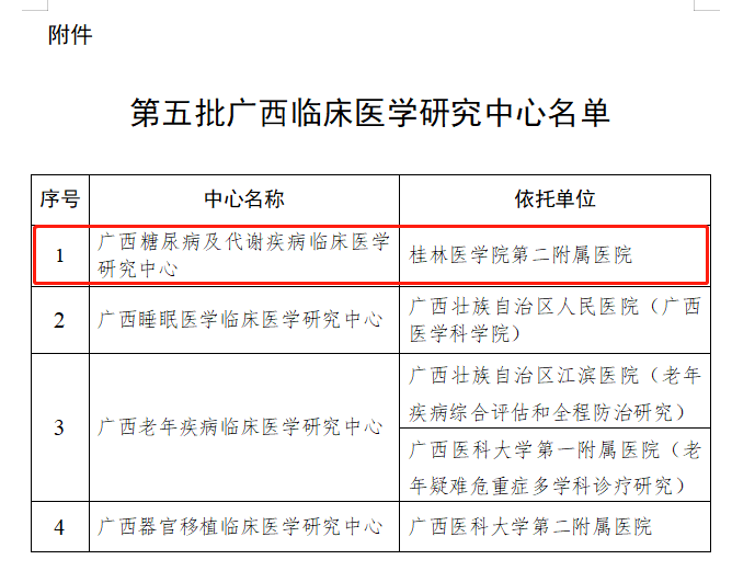 近日,广西壮族自治区科学技术厅、广西壮族自治区卫生健康委员会、广西壮族自治区药品监督管理局联合下文发布了第五批广西医学临床研究中心名单。桂林医学院第二附属医院(临桂临床医学院)获批广西糖尿病及代谢疾病临床医学研究中心,实现了该院省级研究平台零的突破,也是自治区唯一一个糖尿病及代谢疾病领域省级临床医学研究中心。