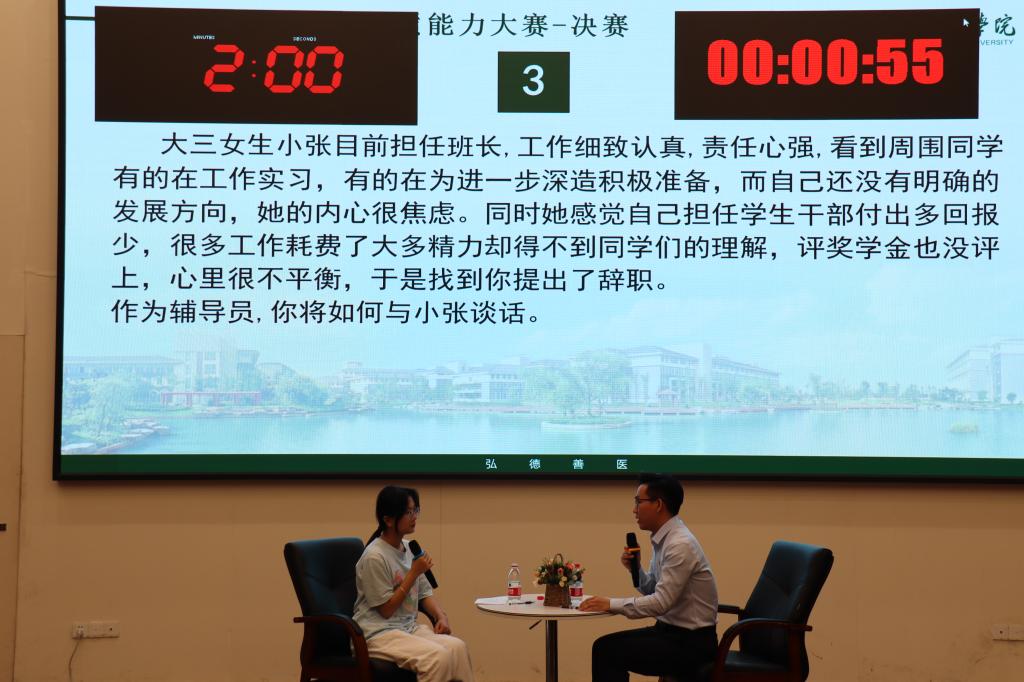 本次辅导员素质能力大赛历时两天,共分为初赛、复赛和决赛三个环节。初赛是笔试环节,学校本专科生辅导员全员参与,通过“大练兵”全方位考核辅导员的理论素养和业务知识。从初赛脱颖而出的20名辅导员进入复赛,结合日常思政工作典型案例锻炼辨析原因、研讨对策、总结规律,展示了我校辅导员良好的综合运用理论分析问题、研判问题、解决问题的能力。从复初赛脱颖而出的10名辅导员进入决赛,以情景再现的方式与学生演员开展谈心谈话,展示了我校辅导员对学生良好的教育引导能力和解决理论困惑和实际问题的能力。