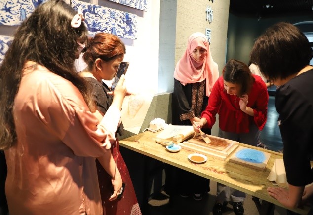 随后,双方负责人就依托实践教育基地开展传统文化传播交流和高素质国际医学人才培养进行了深入探讨。同时,在讲解员的带领下,留学生参观了靖江遗韵——梅瓶陈列馆,领略了不同时代梅瓶的演变和风采。通过传统版画制作体验,留学生了解了版画印拓的制作工艺,切身感受到了中华文化的魅力。