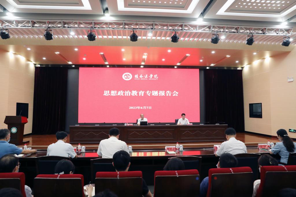 为贯彻落实中央、自治区关于领导干部上讲台开展思想政治教育的部署要求,6月7日下午,广西壮族自治区副主席廖品琥来到桂林医学院,围绕学习贯彻党的二十大精神、推动健康广西建设为学校师生作题为《勇担历史使命主动担当作为在推动健康广西建设中谱写青春华章》的思想政治教育报告。我校党委书记、院长张志勇主持报告会。