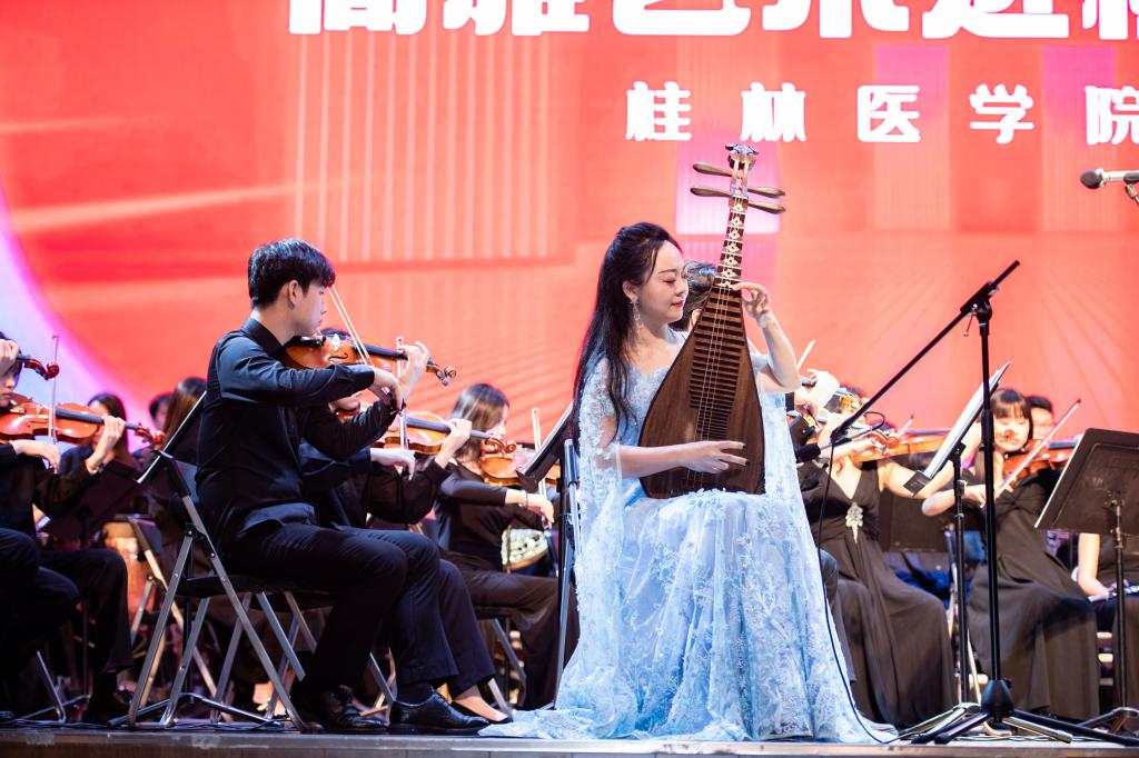 以美促教、以美育人。6月15日晚,广西2023年“高雅艺术进校园”——广西艺术学院交响乐团走进桂林医学院专场在我校大学生活动中心演艺厅举行。学校党委副书记王赣华出席专场音乐会并致辞。学校党委统战部、宣传部、学生工作部(处)、校工会、校团委、各二级学院等相关部门负责人与现场千余名师生共同聆听音乐会。