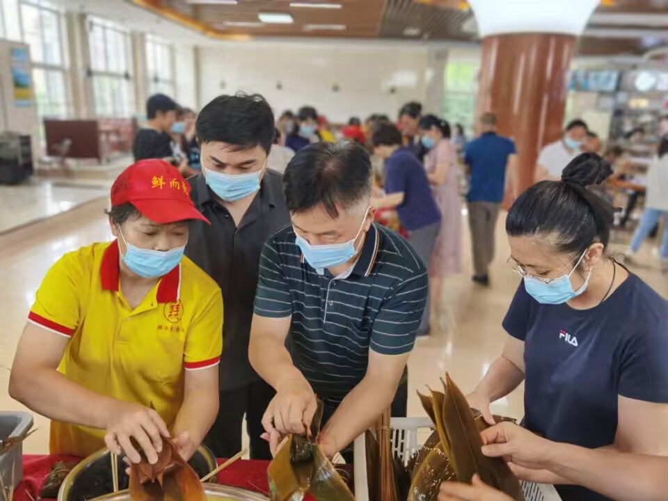 活动不仅提供香粽品尝,教职工还可以体验包粽子。活动现场,工作人员早早就准备好了糯米、粽叶等食材,绳子、剪刀等工具。活动过程中,大家在包粽“能手”的指导下,手持粽叶、填料压实、封口扎捆,有条不紊的包着粽子。经过大家的精心制作,各式各样、独具风格的粽子摆满了桌面。大家边包粽子,边交流包粽子的经验,讲述端午风俗,现场欢声笑语,洋溢着浓厚的节日气氛。