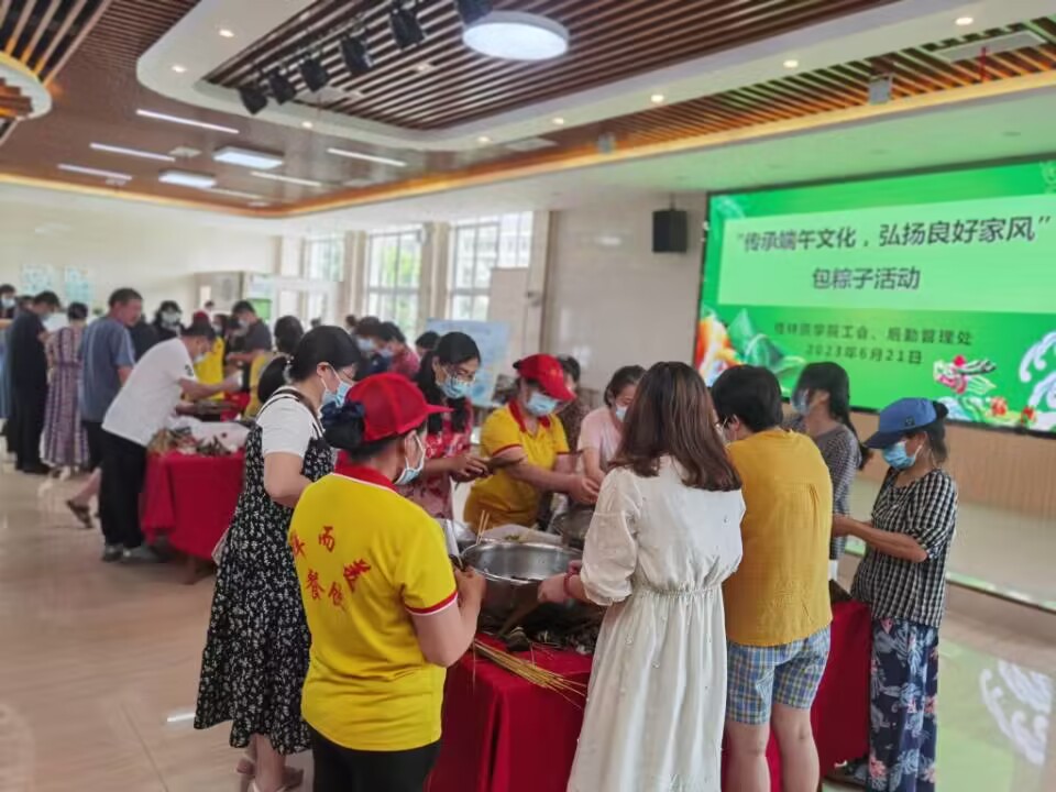 又是一年粽飘香,浓情端午祈安康。在传统端午佳节即将来临之际,为弘扬中华民族传统文化,丰富教职工的业余文化生活,6月21日中午,校工会、后勤管理处在临桂校区秋实苑二楼餐厅联合开展以“传承端午文化,弘扬良好家风”为主题的包粽子活动,活动受到广大教职工积极响应与参与。校党委常委、统战部部长、工会常务副主席李海林,部分校留联会会员,各民主党派、无党派人士代表应邀参加活动。