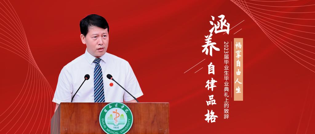 三年前的开学典礼,我以“大学,是这样一个地方”为题,告诉大家“大学是滋养品德之地,是求知求新之地,是健身强志之地,是完善自我之地”。四年前的开学典礼,我致辞的题目是“选择桂医,与美同行”,我说“选择桂医,你就选择了与美好山水和校园为伴;选择桂医,你就选择了与美好心灵和品行结缘;选择桂医,你就选择了与美好前程和未来相遇”。五年前的开学典礼,我写下了“内外兼修,铸就品位”的致辞,叮嘱大家“品位,始于规矩,源于修养,贵于追求,成于自律”。几年过去,同学们从新生成为毕业生,在老师的教导下,在自身的努力下,在湖光浸润、文化深植的校园滋养下,大家升华了德行,丰富了思想,拓宽了视野,完善了人格,提升了品位,学到了知识,完成了学业,今天顺利毕业了,即将投入到强国建设、民族复兴的新征程!在此,我代表全校师生员工对你们表示热烈祝贺!