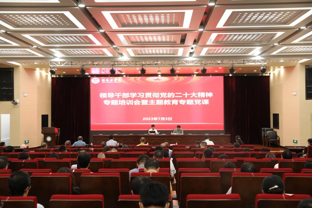 为进一步推动党的二十大精神在学校落地生根,推动主题教育走深走实,根据领导干部学习贯彻党的二十大精神集中轮训及学习贯彻习近平新时代中国特色社会主义思想主题教育相关工作要求,7月3日下午,学校在临桂校区教学北楼多功能报告厅举办领导干部学习贯彻党的二十大精神专题培训会暨主题教育专题党课,校党委书记、院长张志勇作题为“学思践悟、以知促行,以主题教育的扎实成效推动学校工作高质量发展”的专题报告。在家校领导王赣华、辛懋、谢忠文、周国增,以及全体中层干部参加会议。会议由校党委副书记王赣华主持。