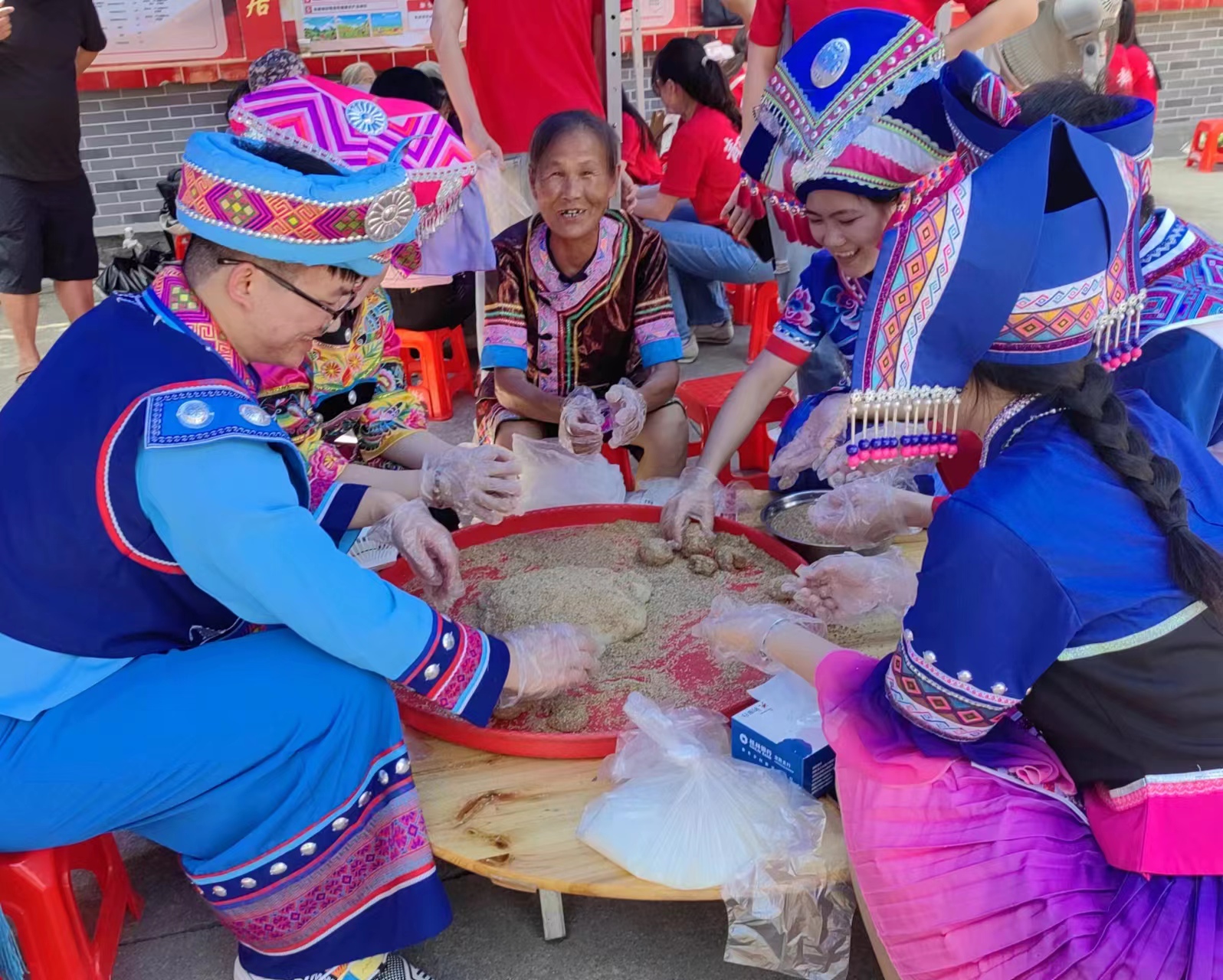 志愿者与村民一起做糍粑、聊家常