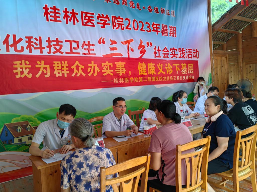 为深入贯彻落实习近平总书记关于青年工作的重要思想,引导和帮助广大青年学生在社会课堂中“受教育、长才干、作贡献”,7月9日至11日,我校70余名师生志愿者及第二附属医院(临桂临床医学院)多名医护人员前往龙胜县三门镇交其村开展“学习二十大 永远跟党走 奋进新征程”为主题的暑期“三下乡”社会实践活动。