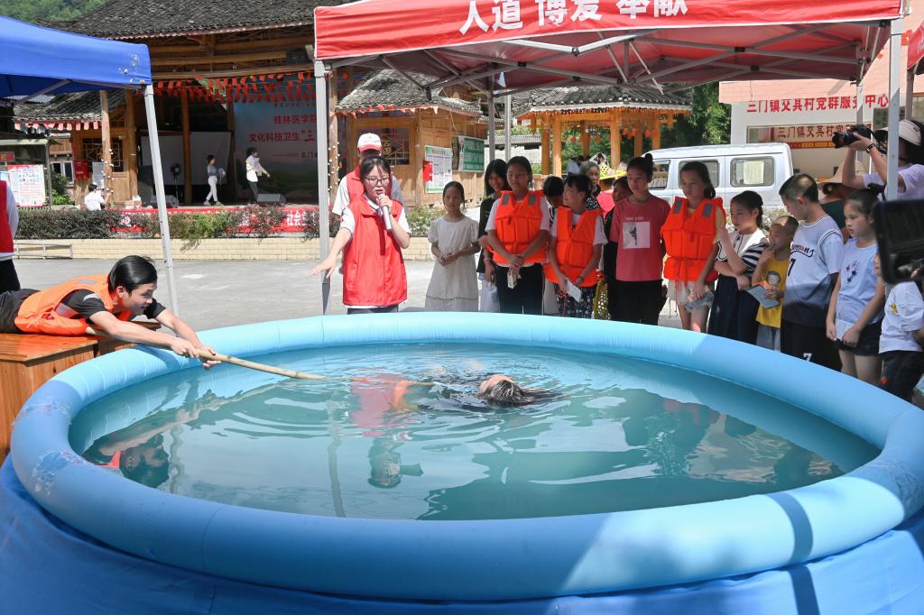 为加强安全教育、宣传结核病防治知识,志愿者分三组在交其村开展教育宣讲活动。一组就心肺复苏内容进行应急救护培训,志愿者首先讲解应急急救知识及“黄金四分钟”的重要性,随后分步演示心肺复苏急救方法,讲解结束后,现场群众纷纷上前用人体模型进行实操训练,在志愿者的指导下,熟悉心肺复苏术的正确操作步骤。另一组就结核病防治知识开展宣传教育,通过视频、图文结合的方式,深入浅出地向村民讲解结核病的流行现状、主要症状和治疗手段等知识,提醒大家养成讲卫生、勤洗手、多通风、勤锻炼的良好生活方式。进入三伏天,青少年儿童溺水事故进入高发期。为提高农村儿童“防溺水”安全意识,第三组志愿者借助“模拟池塘”为孩子们开展了“理论+实践”防溺水安全知识培训,提高孩子们溺水自救和互救能力。志愿者通过寓教于乐的方式让小朋友们乐在其中,现场气氛十分活跃。