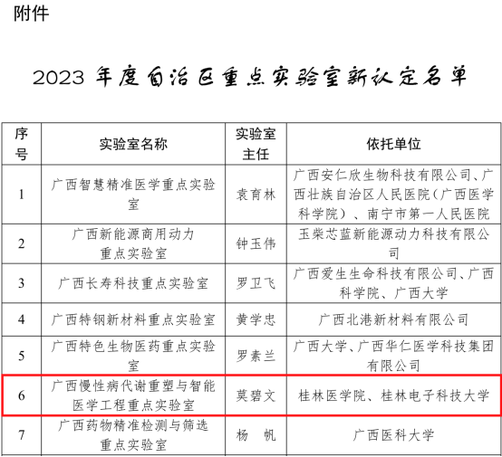近日,广西壮族自治区科学技术厅下发了《自治区科技厅关于公布2023年度自治区重点实验室新认定名单的通知》(桂科基字〔2023〕33号),我校第二附属医院莫碧文教授牵头申报的“广西慢性病代谢重塑与智能医学工程重点实验室”获批认定建设,桂林电子科技大学为共建单位。