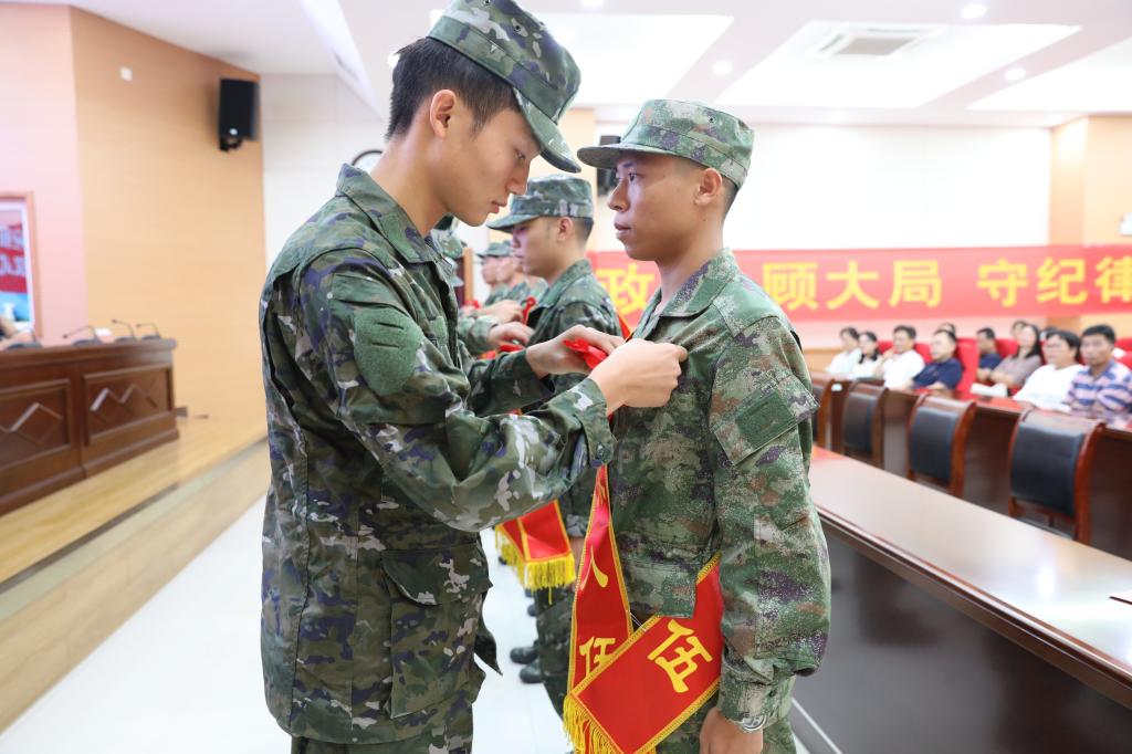 退役复学大学生代表为入伍同学佩戴红花