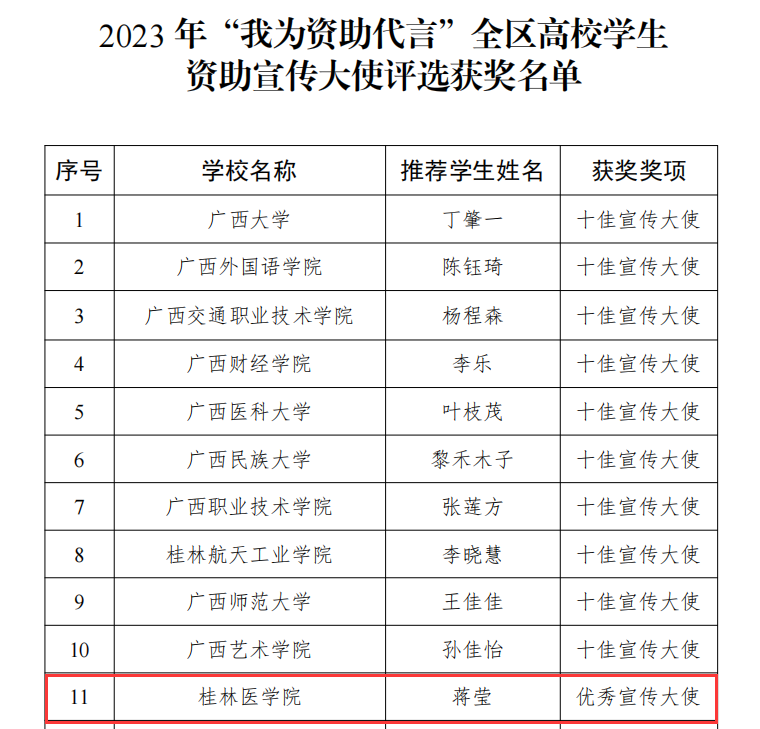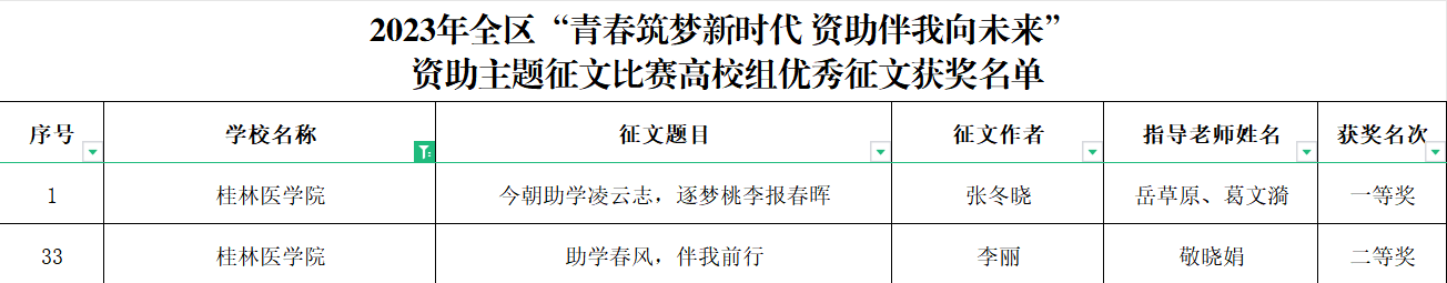 根据《自治区教育厅关于公布2023年全区“青春筑梦新时代 资助伴我向未来”资助主题征文比赛获奖名单的通知》和《自治区教育厅办公室关于公布2023年“我为资助代言”全区高校学生资助宣传大使评选活动获奖名单的通知》,我校选送的2篇征文作品《今朝助学凌云志,逐梦桃李报春晖》(作者:护理学院 张冬晓)、《助学春风,伴我前行(作者:临桂临床医学院 李丽)》分别获得一等奖和二等奖,岳草原、葛文漪、敬晓娟被评为优秀指导老师。我校推荐学生蒋莹参加“我为资助代言”全区高校学生资助宣传大使评选活动,表现突出,获评“优秀宣传大使”称号。