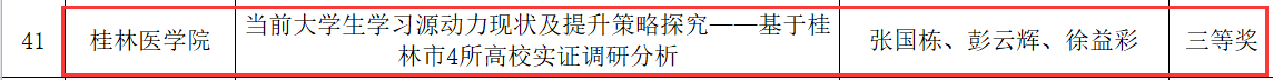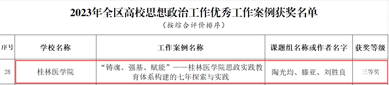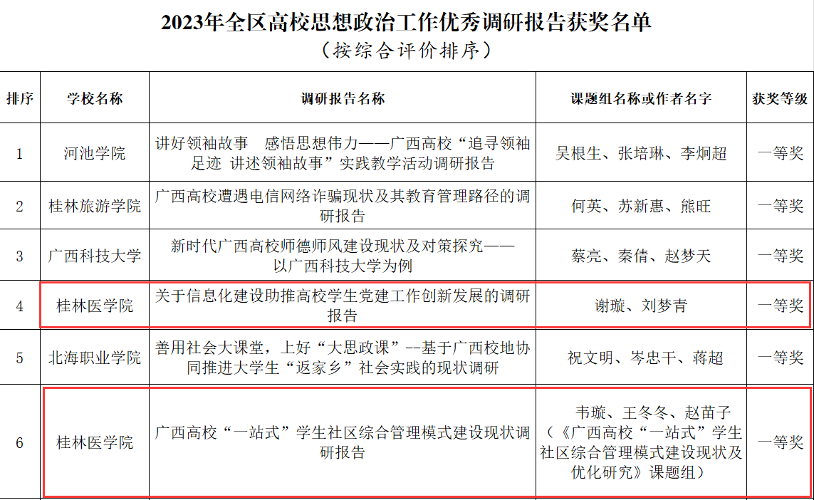 近日,自治区教育厅公布了2023年全区高校思想政治工作优秀调研报告和工作案例获奖名单,我校谢璇、刘梦青撰写的《关于信息化建设助推高校学生党建工作创新发展的调研报告》,韦璇、王冬冬、赵苗子撰写的《广西高校“一站式”学生社区综合管理模式建设现状调研报告》2项调研报告分别荣获全区高校思想政治工作优秀调研报告一等奖;张国栋、彭云辉、徐益彩撰写的《当前大学生学习源动力现状及提升策略探究——基于桂林市4所高校实证调研分析》获全区高校思想政治工作优秀调研报告三等奖;陶光均、滕亚、刘胜良撰写的《“铸魂、强基、赋能”——桂林医学院思政实践教育体系构建的七年探索与实践》荣获全区高校思想政治工作优秀工作案例三等奖。我校将以此次评选为契机,继续引导思想政治教育工作队伍围绕落实立德树人根本任务,进一步加强工作研究、提升理论素养、总结工作经验,推动学校思想政治教育工作再上新台阶。