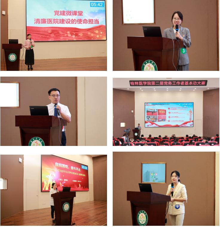 本次大赛分为党务知识测试、微党课和党建工作案例展示三个环节。12日上午,党务知识测试充分考察了参赛选手的理论素养和业务知识。13日上午,微党课比赛中,选手围绕党的光荣传统、党的路线方针政策、近期时事热点、党的建设创新理论以及基层党建工作等方面进行了充分展示;下午进行的党建工作案例比赛,选手围绕强化基层党组织政治功能、提升党组织组织力、严格党员教育管理、提高思想政治工作能力、创新“党建+”工作模式、党建业务深度融合、党建服务经济社会发展等方面,紧密结合自身工作,讲述了具有“桂医”特色的党建品牌和工作案例,高质量呈现了我校党务工作者的业务能力和党建工作亮点及成效。评委及观摩人员对选手的语言表达、讲授内容、形象礼仪、课件制作等方面表现给予了高度评价,现场气氛热烈。