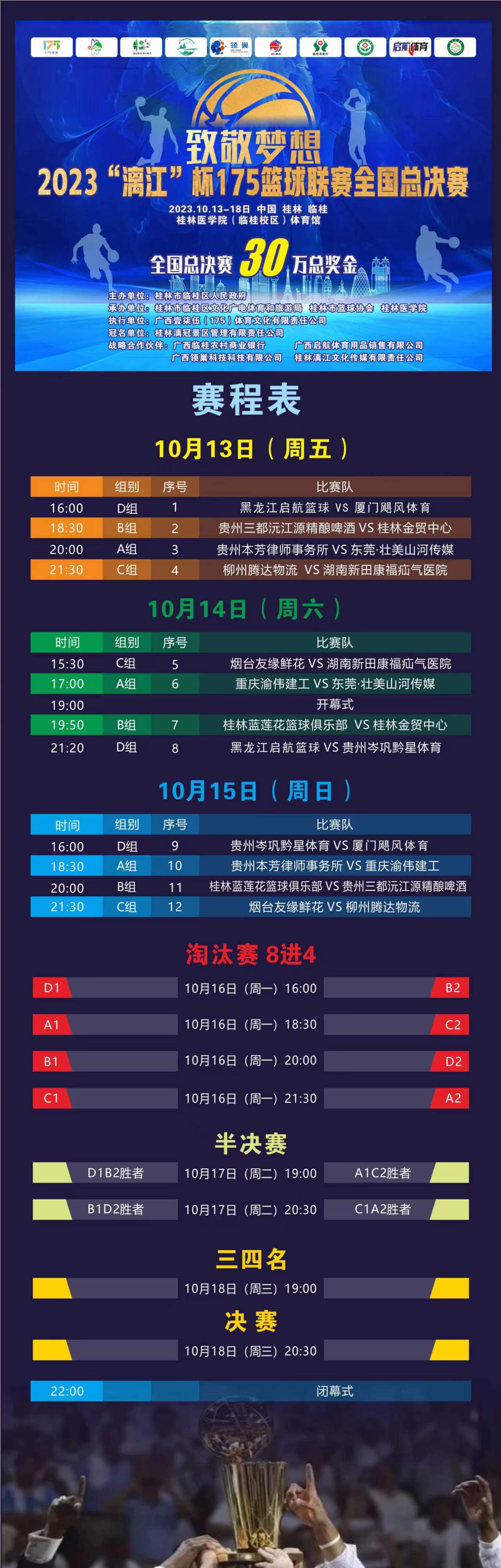 据悉,本届“漓江”杯175篮球联赛全国总决赛共有来自重庆、贵州、烟台等地的12支队伍参赛,这些队伍分为4个小组进行循环赛,决出各小组前2名按上下半区进行交叉淘汰直至决出前四名,最终将在10月18日决出联赛总冠军。