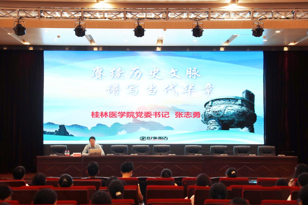 10月19日上午,掌声在临桂校区教学北楼多功能报告厅频频响起,校党委书记张志勇正在为2023级临床医学专业、2023级公共事业管理类专业的本科生讲授思想政治理论课。