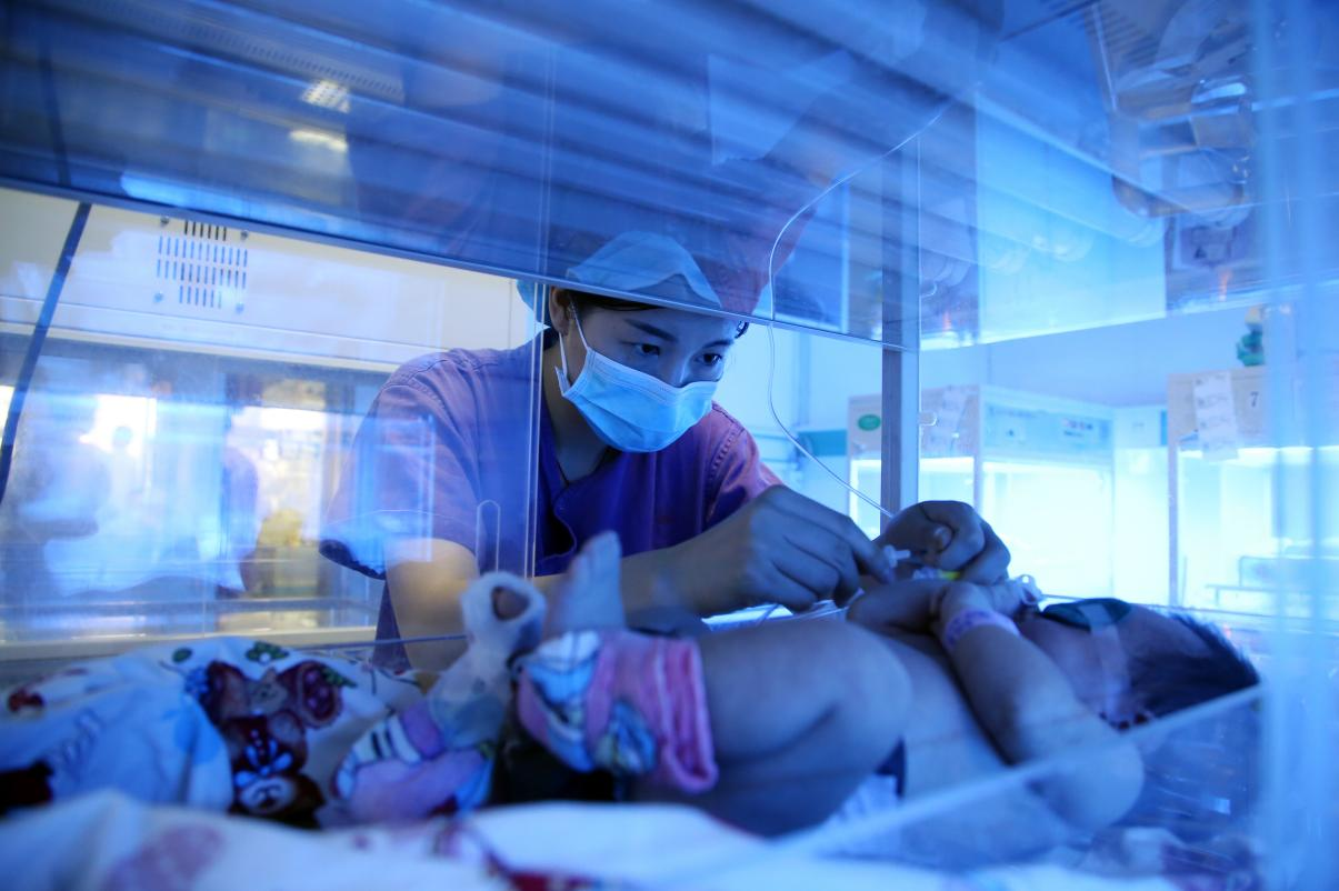 新生儿科护士在护理早产宝宝