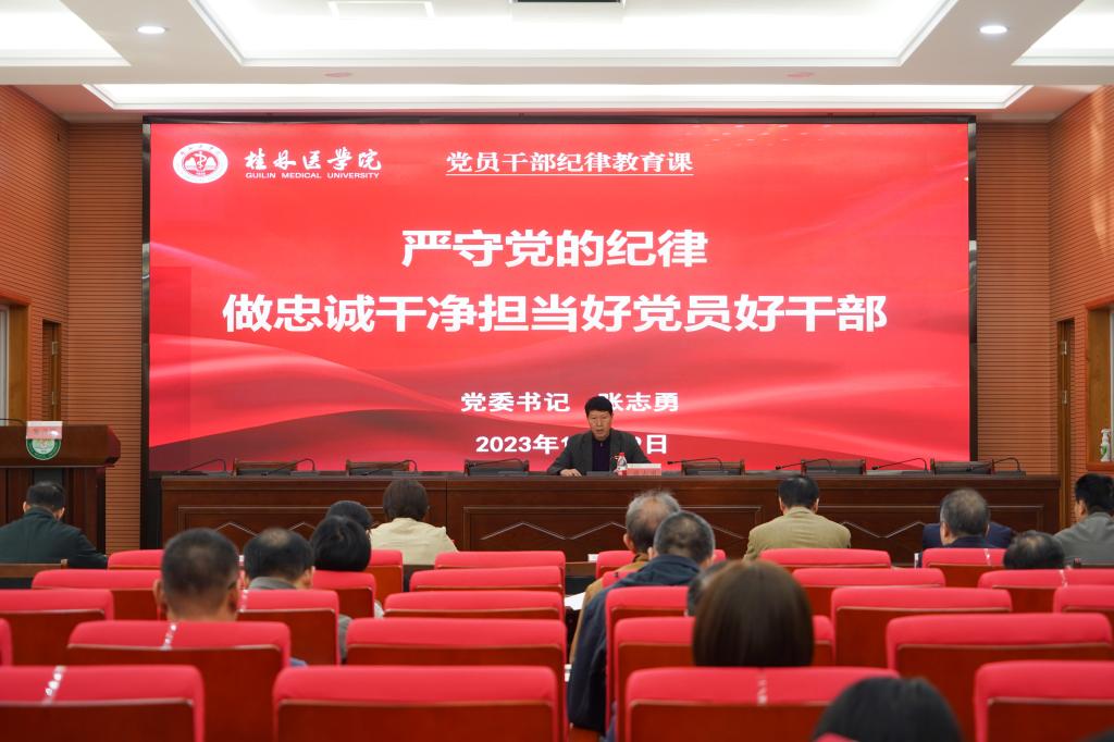 为深入学习贯彻党的二十大精神,不断增强党员领导干部廉洁自律意识,以自我革命精神纵深推进全面从严治党和党风廉政建设,11月29日上午,校党委书记张志勇在临桂校区明德楼101会议室为学校党员领导干部讲授了一堂纪律教育课。校领导班子成员、校直各单位各部门主要负责人参加了纪律教育课。
