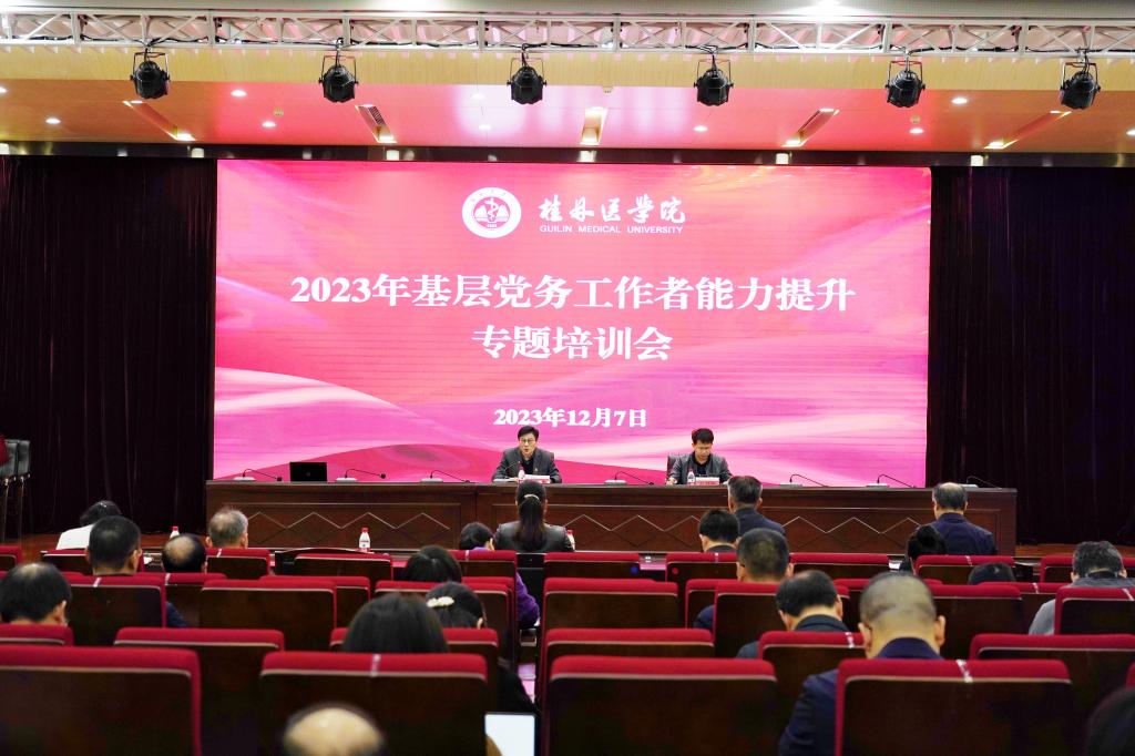 为进一步深入学习贯彻习近平新时代中国特色社会主义思想和党的二十大精神,提升学校基层党务工作队伍的政治素质和业务能力,12月7日-8日,我校在临桂校区教学北楼多功能报告厅举办2023年基层党务工作者能力提升专题培训班。校党委副书记王赣华出席开班式并讲话,各二级党委书记、副书记、专兼职组织员,各基层党支部书记、副书记等基层党务工作者共计150余人参加培训。