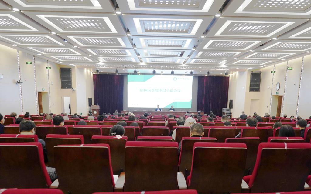 1月16日下午,我校在临桂校区公共教室北楼多功能报告厅召开期末全校中层干部会议。学校领导张志勇、曾小云、王赣华、陈旭、李清华、韦政权、周国增及全体中层干部参加会议。会议由校党委书记张志勇主持,校党委副书记、院长曾小云作工作部署。