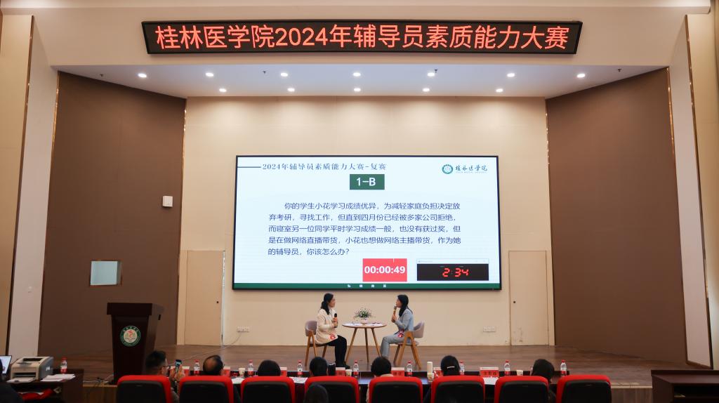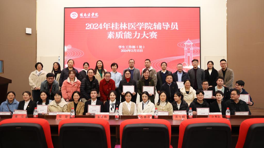 为深入学习贯彻习近平新时代中国特色社会主义思想,全面落实党的二十大精神,落实“时代新人铸魂工程”工作要求,3月15日,我校2024年辅导员素质能力大赛复赛、决赛在临桂校区国际教育交流中心一楼报告厅举行。学生工作部(处)、研究生工作部、部分二级学院负责人担任大赛评委,全体专兼职辅导员观摩比赛。