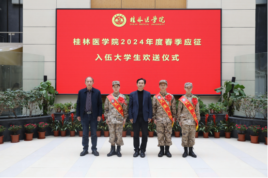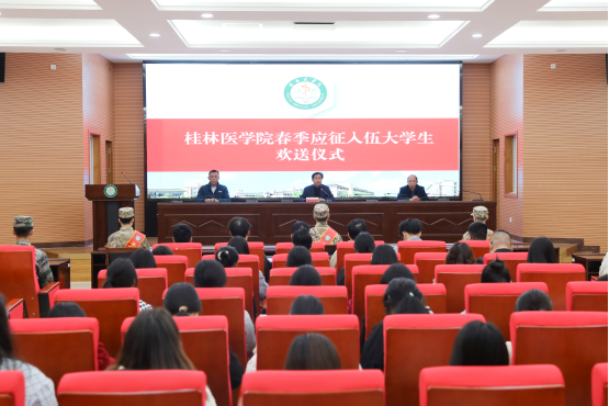 3月18日下午,我校在临桂校区明德楼1楼多功能报告厅举行2024年春季应征入伍大学生欢送仪式,为即将奔赴军营的新兵送行。学校党委常委、副院长李清华出席并讲话,校征兵工作领导小组成员、征兵工作站人员、入伍学生班级辅导员、学生代表、家长代表参加。