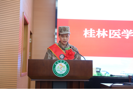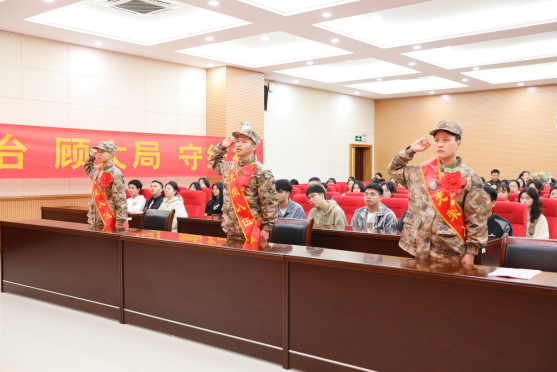 武装部负责人介绍了学校2024年春季入伍同学的基本概况。退役复学大学生代表向入伍同学佩戴红花。人文与管理学院刘六萍同学作为入伍大学生代表发言并领誓。