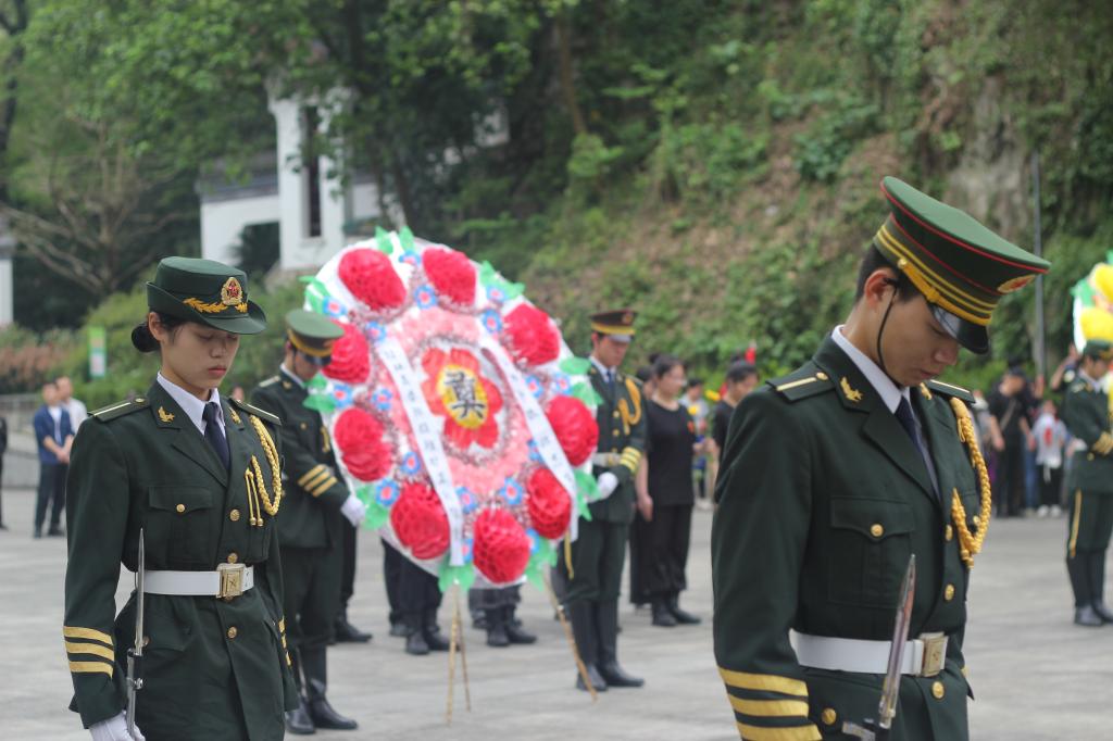 在雄壮的国歌声中,国旗护卫队迎旗手迈着坚定步伐护卫着五星红旗行进到纪念碑前,在场全体师生肃立,迎国旗,唱国歌。国歌唱毕,国旗护卫队代表向烈士纪念碑敬献花篮,然后发表悼念词,表达对革命先烈的敬仰和缅怀之情,表示将继承先烈遗志、弘扬爱国主义精神。接着,队员们依次走到纪念碑前,献上手中鲜花并瞻仰纪念碑。