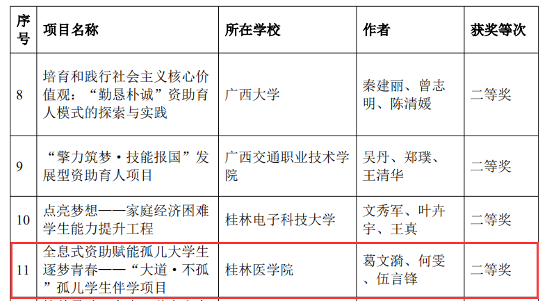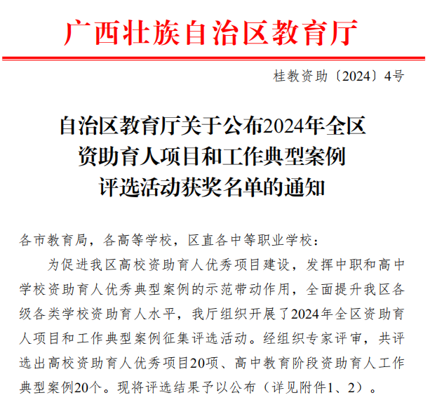 近日,广西壮族自治区教育厅下发了《自治区教育厅关于公布2024年全区资助育人项目和工作典型案例评选活动获奖名单的通知》,我校报送的资助育人项目《全息式资助赋能孤儿大学生逐梦青春——“大道·不孤”孤儿学生伴学项目》获2024年全区高校资助育人优秀项目二等奖。