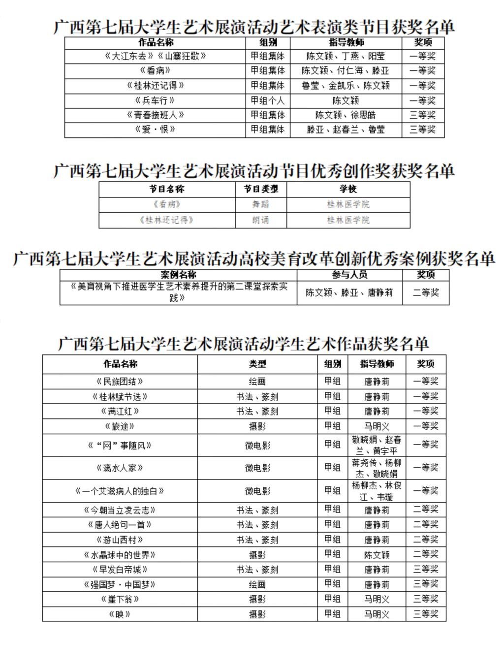 4月15日,广西第七届大学生艺术展演活动获奖名单公布,我校共荣获一等奖11项、二等奖4项、三等奖7项、节目优秀创作奖2项。其中舞蹈《冷暖人心》(原名《看病》)、朗诵《追光》(原名《桂林还记得》)入选参加全国第七届大学生艺术展演,相较于往届大学生艺术展演,我校一等奖获奖数量、入选全国展演数量再创新高。