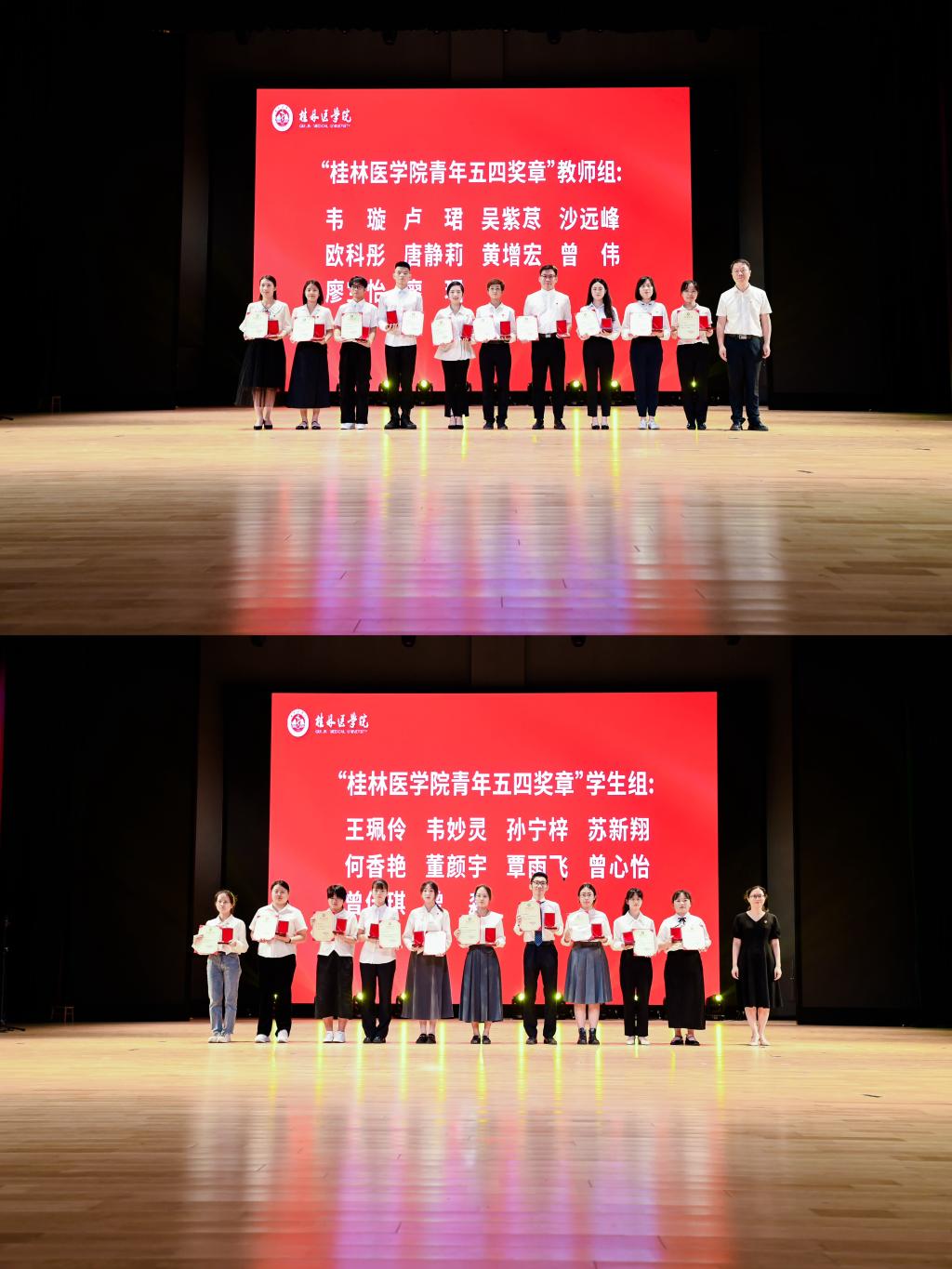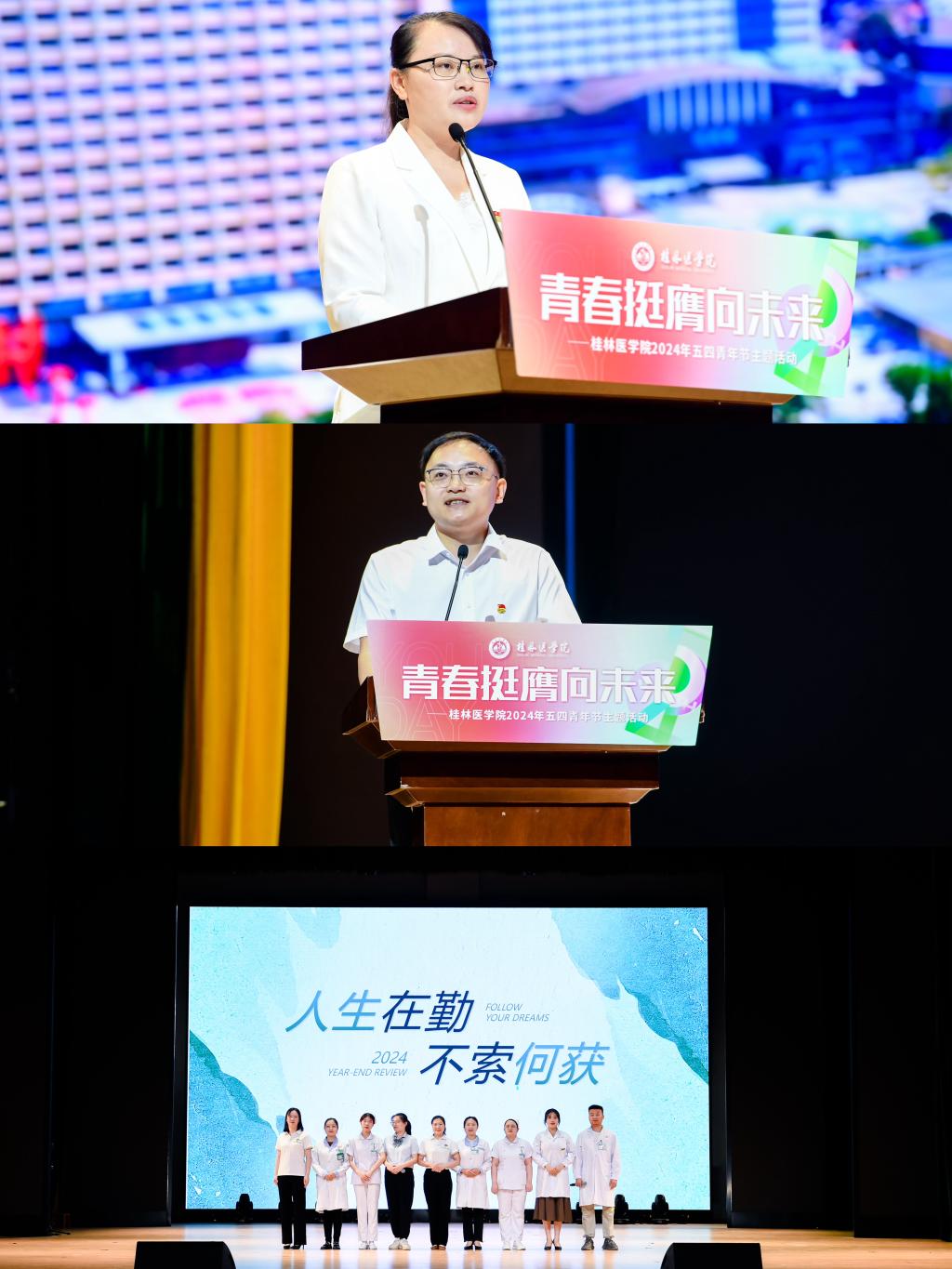 在主题活动主会场,先后举行了我校2024年入团仪式、青春分享及2024年“桂林医学院青年五四奖章”颁奖仪式。入团仪式中,全校130名新团员在团旗下庄严宣誓。青春分享环节中,2023年广西青年五四奖章获得者罗丹桂、第一附属医院青年文明号代表、第十四届中国青年志愿者优秀个人陶光均分别用他们的青春故事,激励广大桂医青年发挥青年力量,践行使命担当。在2024年“桂林医学院青年五四奖章”获奖师生事迹现场展示中,青年师生们的事迹展示了自己用实际行动践行无愧于时代的青春誓言。