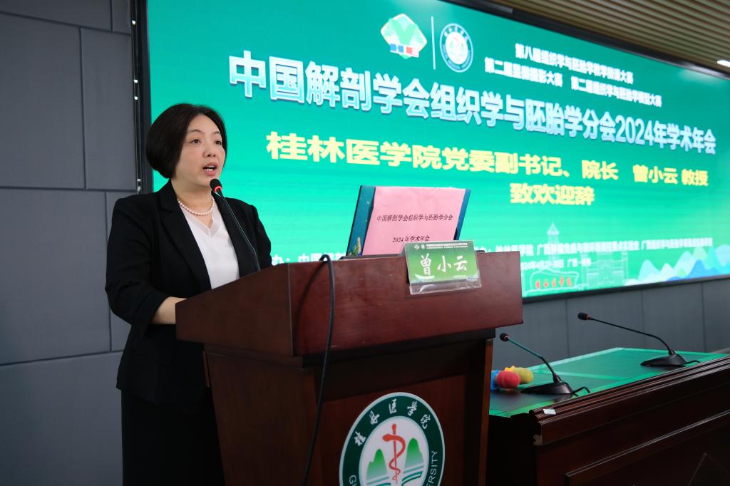 曾小云对全国各地组胚专家和学者莅临桂林医学院表示热烈欢迎。她介绍了桂林医学院的发展历程、建设成效及未来规划。她在致辞中强调,桂林医学院的发展得到了各兄弟院校领导、专家及同仁们的大力支持,希望以此次大会为契机,在推动我国组胚学科建设的同时,也让大家进一步了解桂林医学院,并一如既往地关心我校未来的发展和进步。