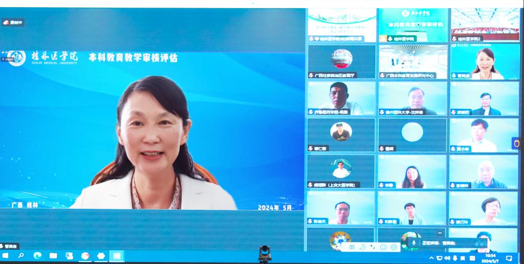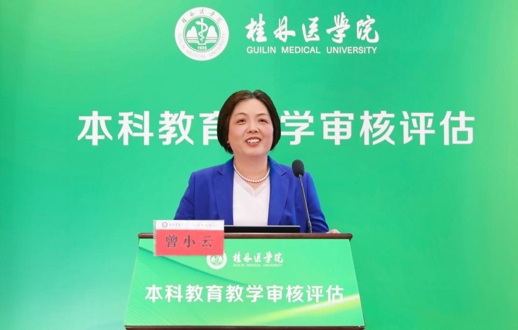 校党委副书记、院长曾小云代表学校以《强基固本蓄势赋能 创新求变勇争一流》为题向专家们进行汇报。她从坚守初心使命、落实立德树人根本任务,坚持培根铸魂、践行以本为本核心地位,坚定发展自信、建设良好声誉医科大学等三个部分对学校历史发展、总体概况及本科教育基本情况作了详细汇报,并提出了“12345”的新愿景。她表示,新一轮本科教育教学审核评估是对学校教育教学和人才培养工作的一次全面检验,更是推动学校高质量建设和发展的重要机遇。学校将认真领会,总结落实,审视短板,持续改进,继续做好强基固本、创新求变,持续为落实健康中国、服务壮美广西建设、打造桂林世界级旅游城市、推动医疗卫生行业人才高质量培养蓄势赋能、勇争一流。