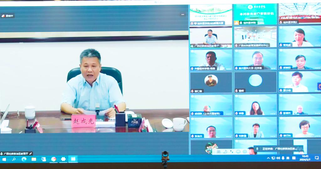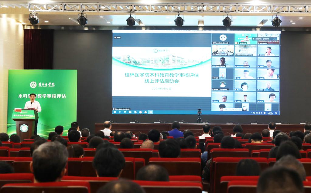5月7日上午,我校召开新一轮本科教育教学审核评估线上评估启动会,会议采取线上线下相结合的形式召开。广西壮族自治区教育厅二级巡视员赵成光,广西本科教育发展研究中心副主任、南宁师范大学副校长龙妮娜,由山东第二医科大学校长管英俊教授担任组长、西安医学院副院长和新盈教授担任副组长的教育部审核评估专家组全体成员,广西壮族自治区教育厅、广西本科教育发展研究中心相关负责人在线出席会议。我校全体校领导在临桂校区教学北楼多功能报告厅参会。会议由校党委常委、副院长李清华主持。