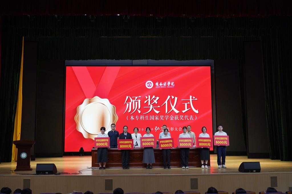 校领导与爱心企业嘉宾共同为获得国家奖学金、校长奖学金、社会类奖助学金、桂医优秀学子等各级奖项的48名本专科生及研究生代表颁奖,为捐赠企业及校友颁发了捐赠证书。现场掌声如鸣,气氛热烈。国家奖学金获奖学生代表、优秀学子代表做了成长故事分享,展现了桂医学子刻苦钻研、自强不息的优秀品质,散发出勇于拼搏、奋发向上的蓬勃朝气。