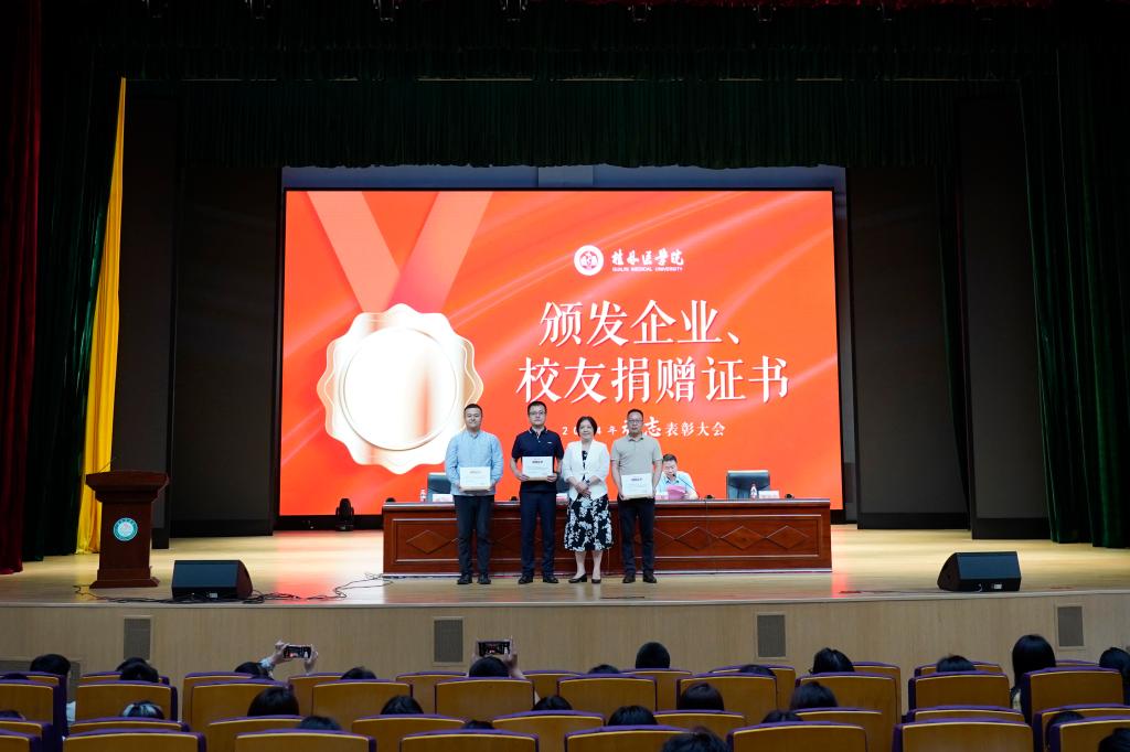 大会邀请了学生家长和校友代表到场见证。学生家长代表的发言质朴情真,感人至深。她感谢老师们用知识为孩子们的前行铺路,用爱心和耐心为孩子们健康成长保驾护航。她感谢学校通过奖助学金、勤工助学等方式把党和政府的温暖及时送到手中,帮助家庭渡过难关,为孩子求学提供有力支撑。陈宇作为爱心企业嘉宾代表发言,他希望能与桂林医学院进一步合作,实现学校、企业、学生的共同进步。