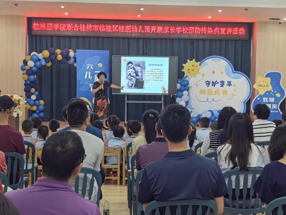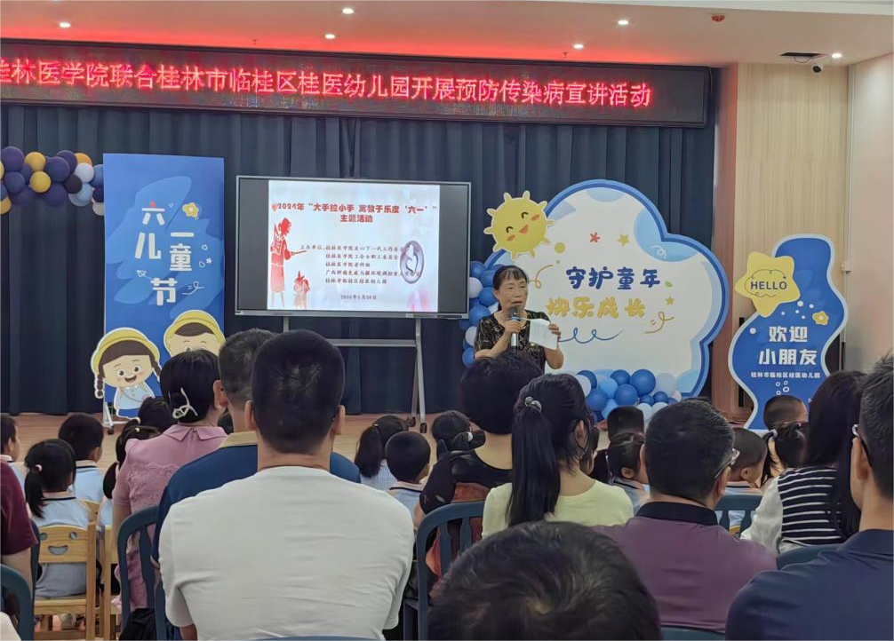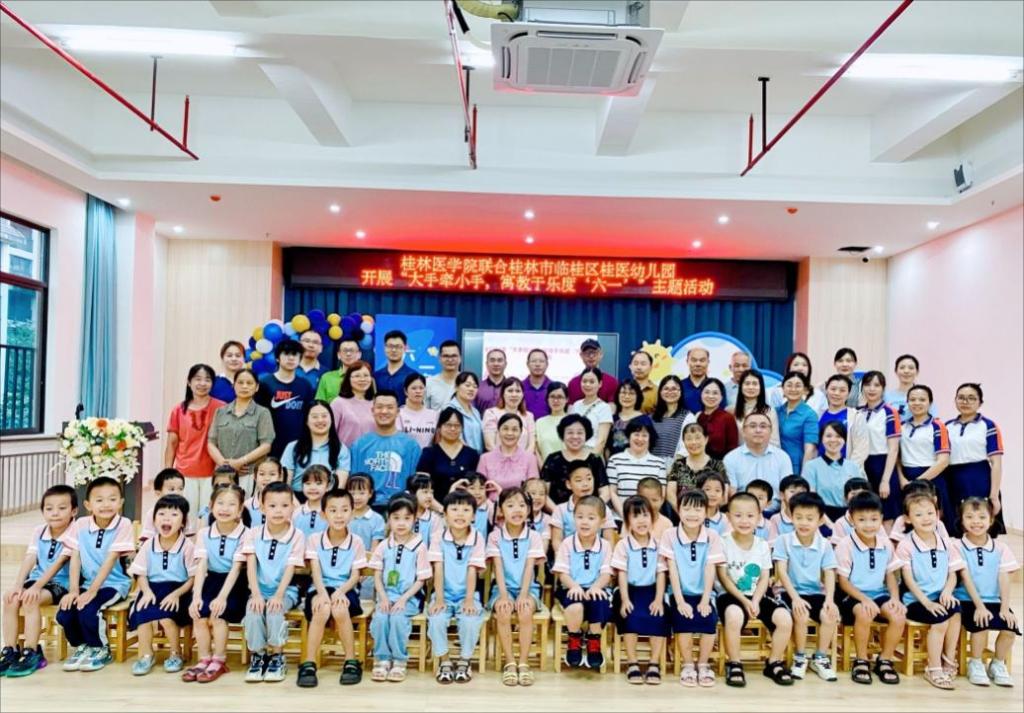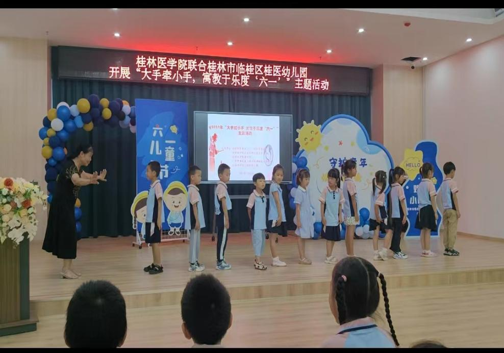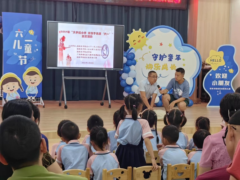 为深入贯彻落实习近平总书记关于关心下一代工作的一系列重要指示,关心关爱儿童健康成长,5月30日下午,我校关心下一代工作委员会(以下称“关工委”)联合学校老科协、老教授协会、广西肿瘤免疫与微环境调控重点实验室、校工会女工委走进桂林市临桂区桂医幼儿园,开展“大手牵小手、寓教于乐度‘六一’”系列活动。活动由校关工委委员叶曼琪老师主持。