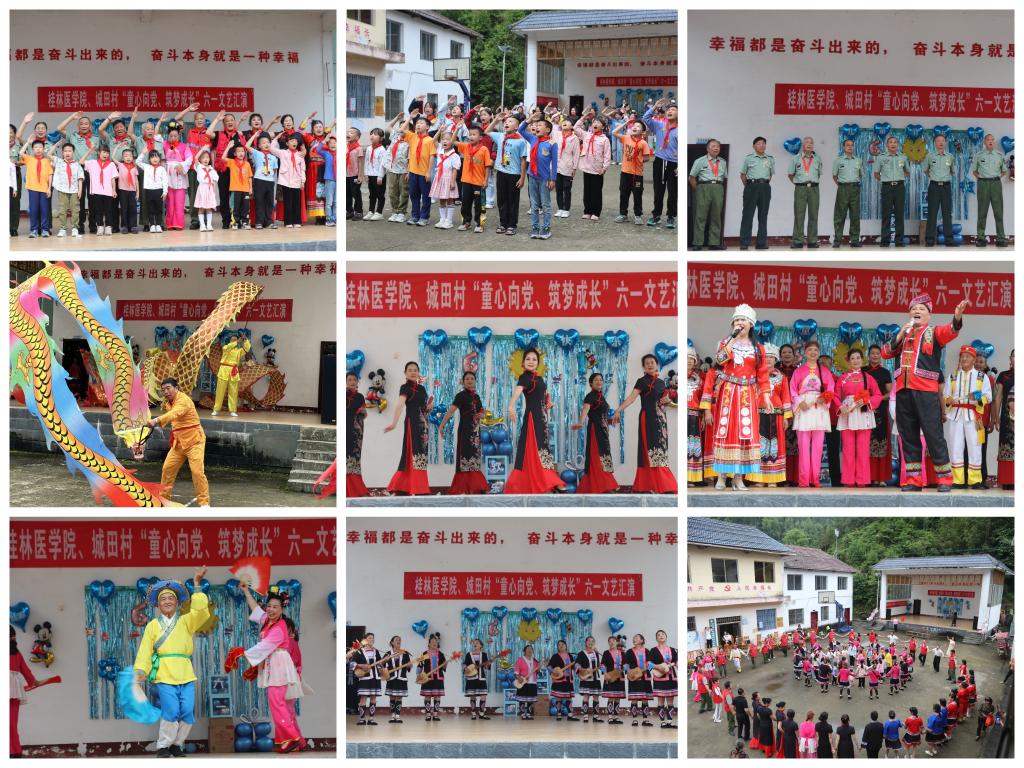 节日当天,桂林医学院乡村振兴办组织桂林退役军人“八桂军号”文明实践服务队30余人,在城田村举办了“童心向党,筑梦成长”文艺汇演活动。城田村的优秀少先队员代表为嘉宾们献上红领巾,全体奏唱国歌,举行升国旗仪式。舞蹈《欢迎你到壮乡来》拉开序幕,对来宾们的热烈欢迎。老兵艺术团送来的六个节目,个个精彩纷呈,赢得观众阵阵喝彩,特别是舞龙表演《广西尼的呀》《军歌联唱》《茶山对歌》,既展现出退役军人风采,又彰显出时代正能量;时装秀《清韵女神》舞姿优美,曲调高雅,给人眼前一亮;彩调《四门摘花》展现了非遗文化彩调的魅力和古韵;歌舞《漓江放歌》,让人感到耳目一新;平熬村表演的舞蹈《土家生来爱唱歌》传递出少数民族赞美新时代,热爱新生活的强劲足音。
